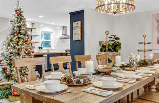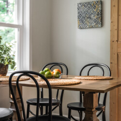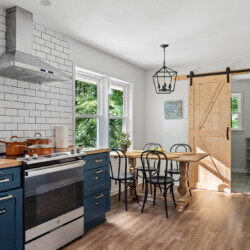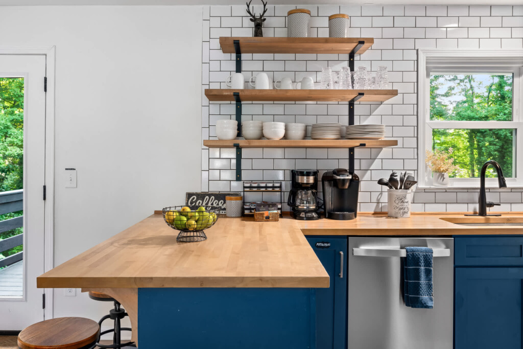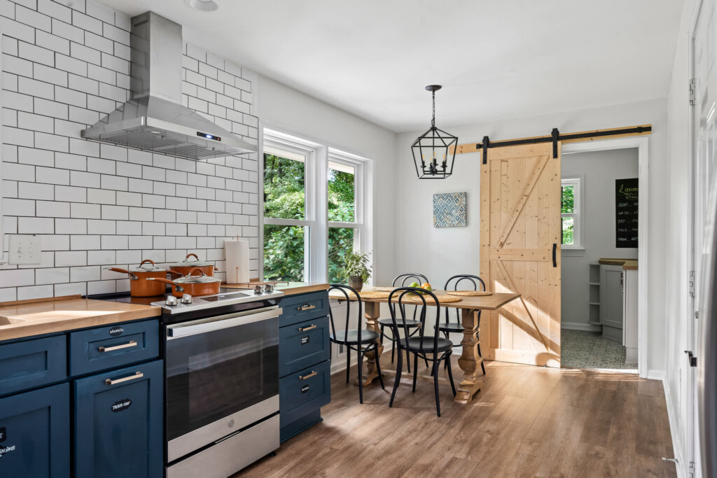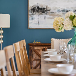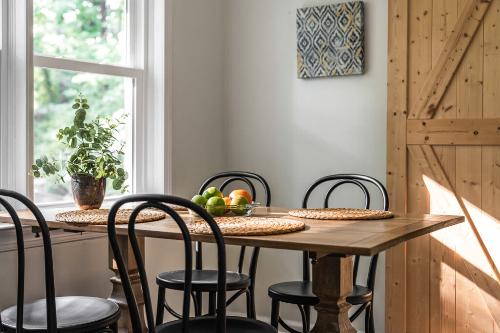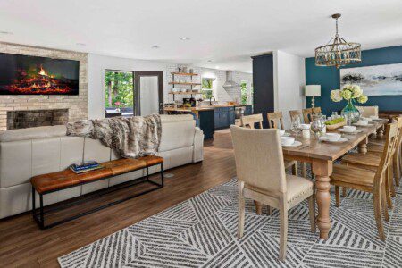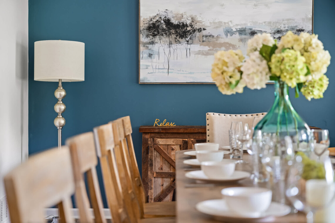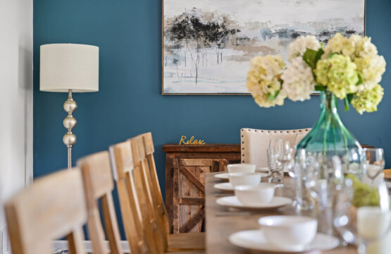 You’ll also find a breakfast table, so you can sit in the morning and enjoy a hot cup of coffee before the rest of your group wakes up. Enjoy group meals around the spacious wood dining table, which has seating for 12-14 guests The ornate chandelier and numerous windows provide plenty of light to brighten the space where you’ll be making happy memories.