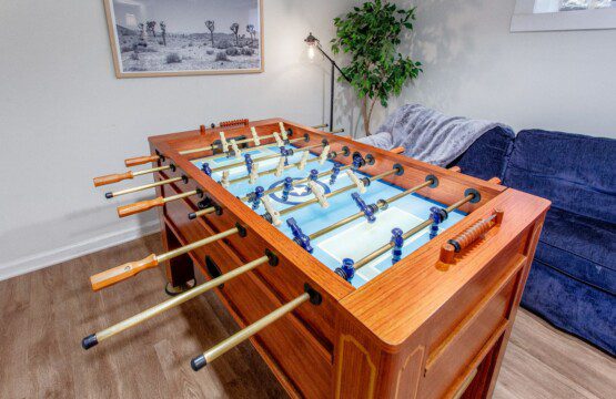 When you’re ready for more entertainment, make your way downstairs to the game room. The adults will especially love this grownup playroom, with a wet bar, TV, pool table, a foosball table, and a fridge to keep your favourite beverages cold.