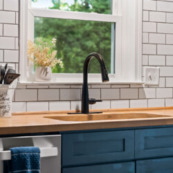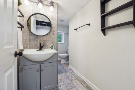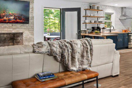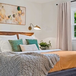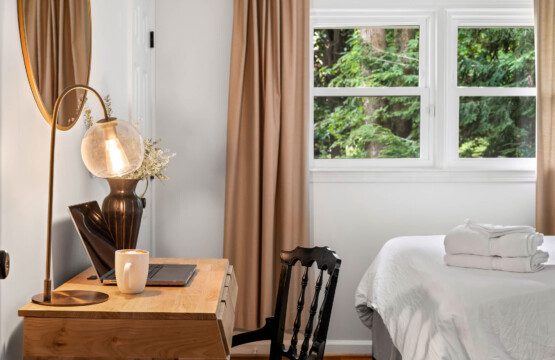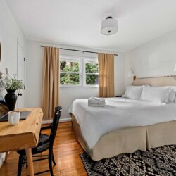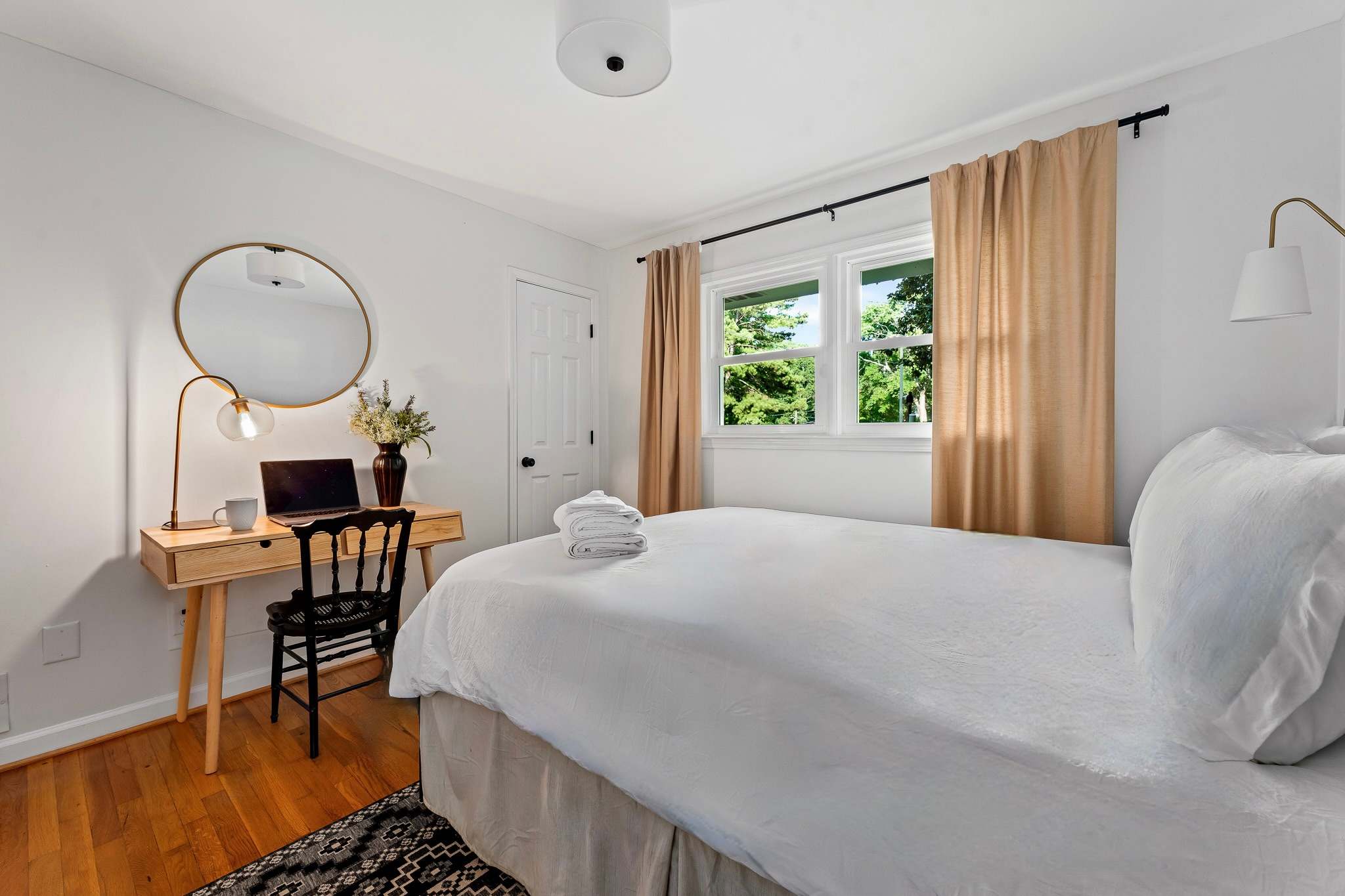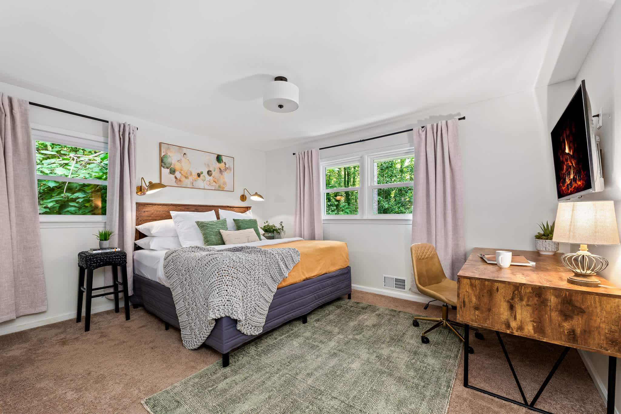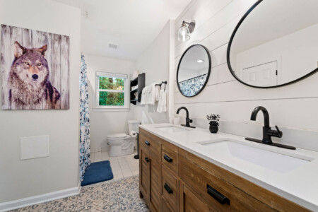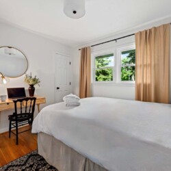 Drift off to sleep in one of the five comfortable bedrooms. On the main floor, you’ll find three beautifully-decorated bedrooms. The primary suite has a king-sized bed, a TV, and a desk you can use to get some work done (if you must). This room has a spacious ensuite bathroom with a gorgeous double vanity and modern black fixtures.