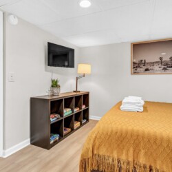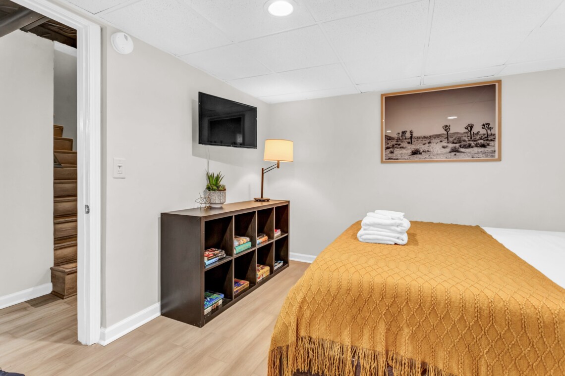 Make your way downstairs where you’ll find two more bedrooms in the basement. One is furnished with a queen-sized bed and a single bed as well as a TV and a walk-in closet where you can unpack your belongings. The second bedroom downstairs has two single beds, ideal for younger or single members of your group.