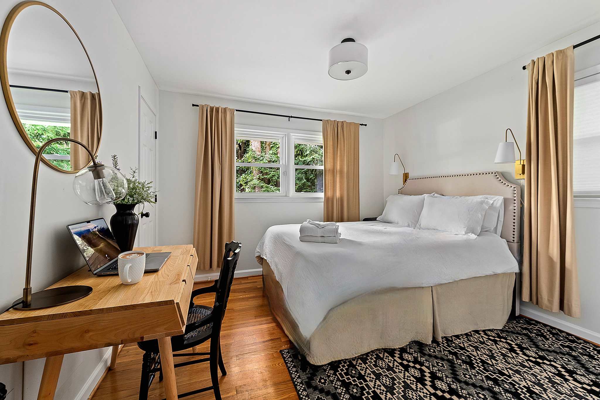 The other two bedrooms on the main floor share a Jack and Jill bathroom with a shower and bathtub combo. One of them has a queen-sized bed and a desk, while the other has a king-sized bed.