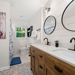 There is a full bathroom in the hall to cater to these bathrooms. All three bathrooms are stocked with fresh towels, hair dryers, soap, and shampoo.