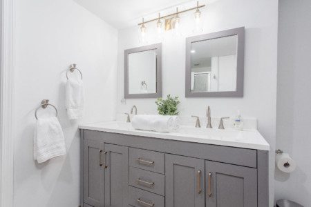 The full kitchen is sure to bring out your inner chef. This modern space features sleek granite countertops, modern stainless steel appliances, and all the basic cookware, baking equipment, dishes, and utensils you’ll need to whip up tasty meals for your whole group. A double oven and a five-burner stove ensure you can easily cook for a large group. We provide cooking oil, salt, pepper, and garlic to get you started.