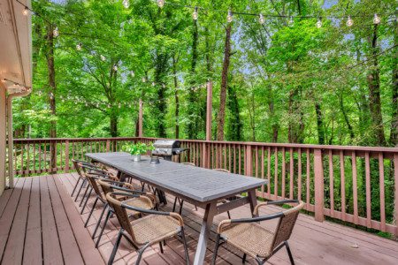 There is also a spacious open-air deck with great views of the forest below. This area features a massive dining table (seating for 12-14), a gas grill, and overhead string lights for the perfect evening vibe.