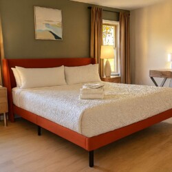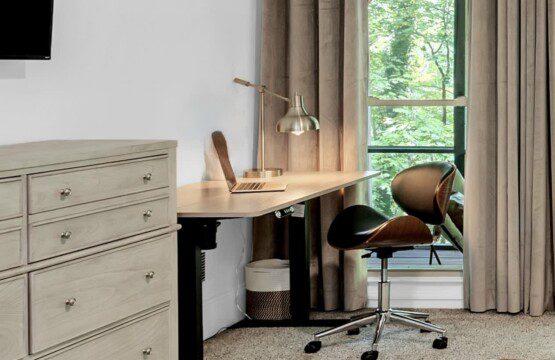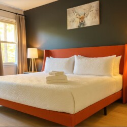 The primary bedroom is on the main floor and features a king-sized bed, a 55″ Smart TV, a chair, and a walk-in closet where you can unpack your belongings. There is also an electric height-adjustable standing desk for anyone who needs to keep up with work while away. Once you’re ready for a break from screen time, step out onto the tree-lined porch – directly accessible from the bedroom.