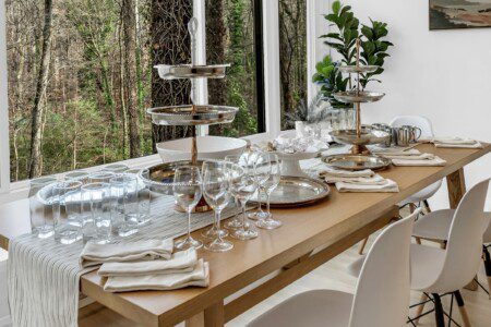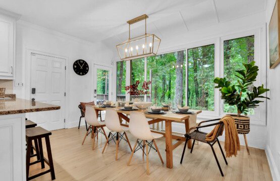 The comfortable living room provides a relaxing atmosphere for you to kick back and get into full vacation mode. Whether you’re streaming your favourite shows on the Smart TV, planning for another exciting day around Stone Mountain, or simply enjoying the views from the large windows, this bright and airy room is perfect for chilling out. The Roku TV (like all others in the house) is set up with streaming channels (including Netflix and Disney+) so you’ll never be short of great things to watch!
