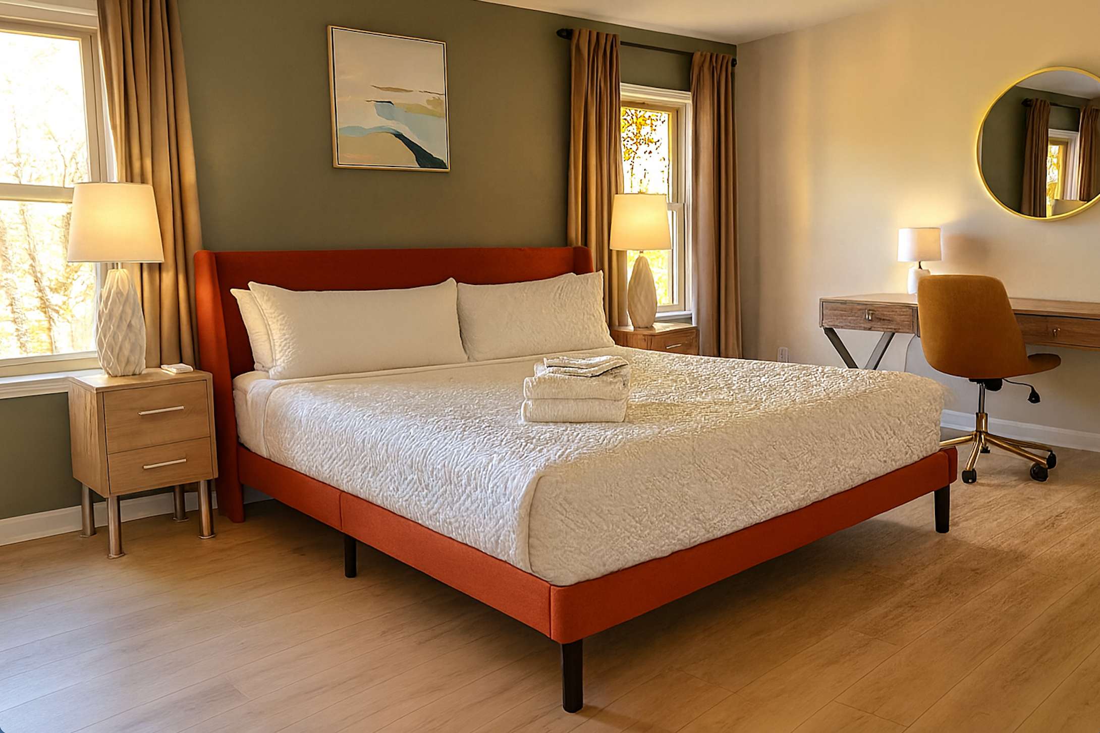 The king suite is great for anyone with youngsters. This room boasts a king-sized bed, a crib, a walk-in closet, a Smart TV, and a private bathroom with a relaxing soaking tub (Bathroom 2). This bedroom also has a desk for any digital nomads in the group.