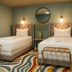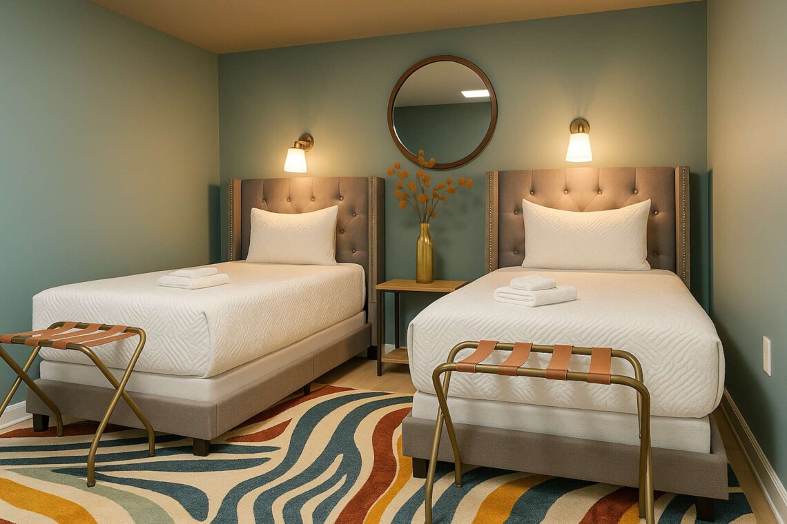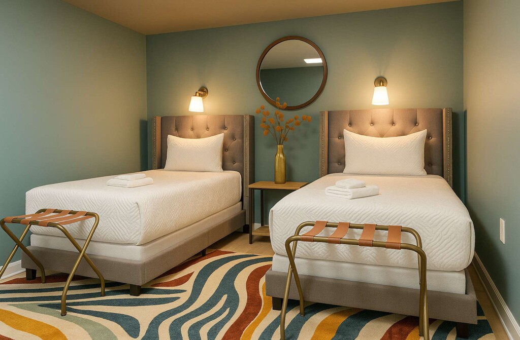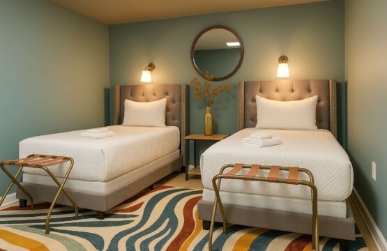 The seventh bedroom features two twin-sized beds with overhead reading lamps. Perfect for guests of all ages!