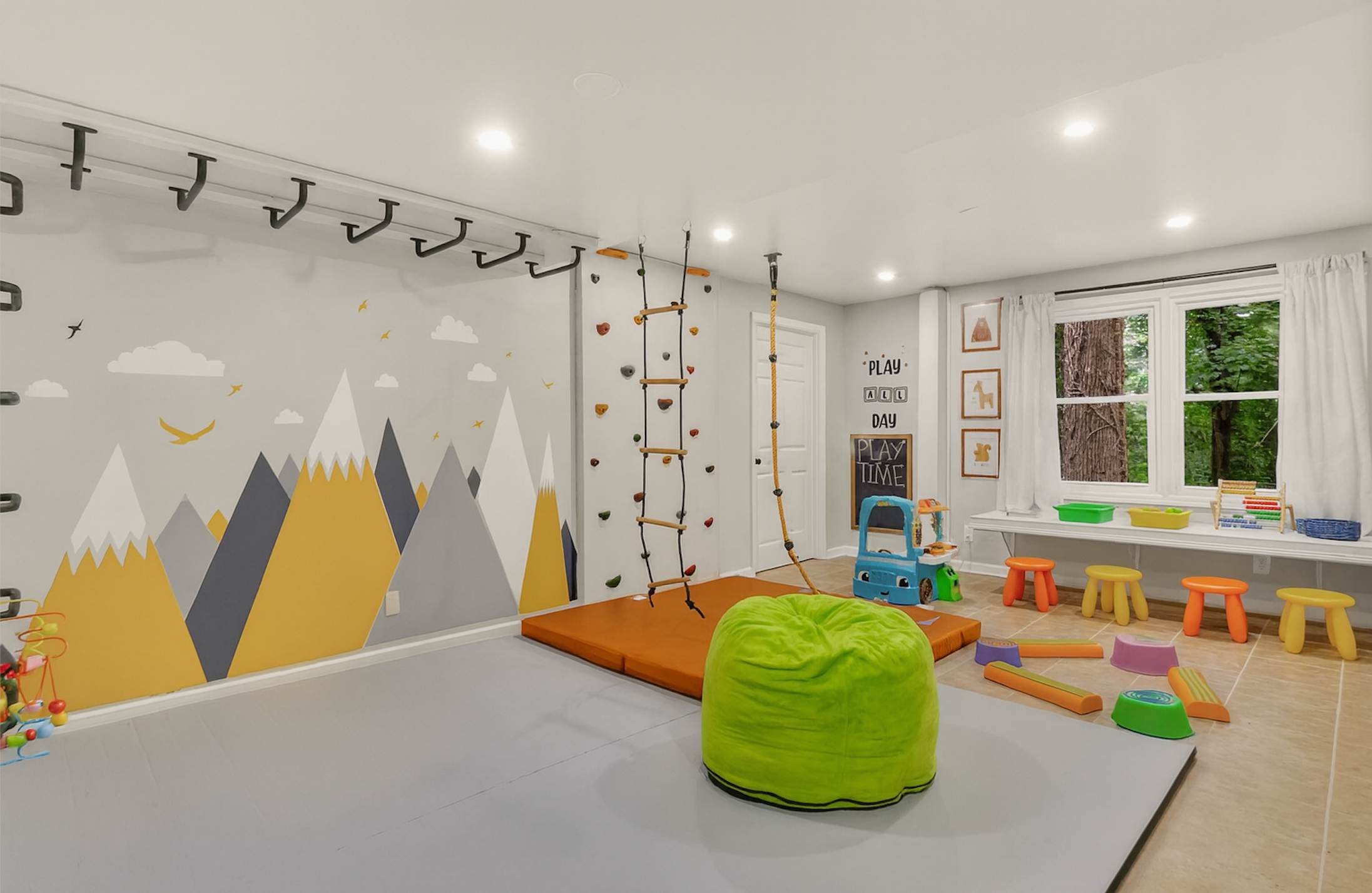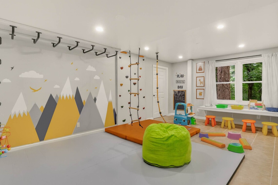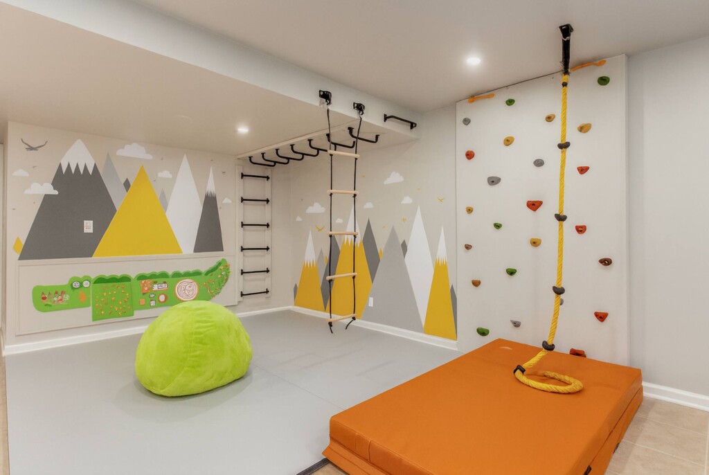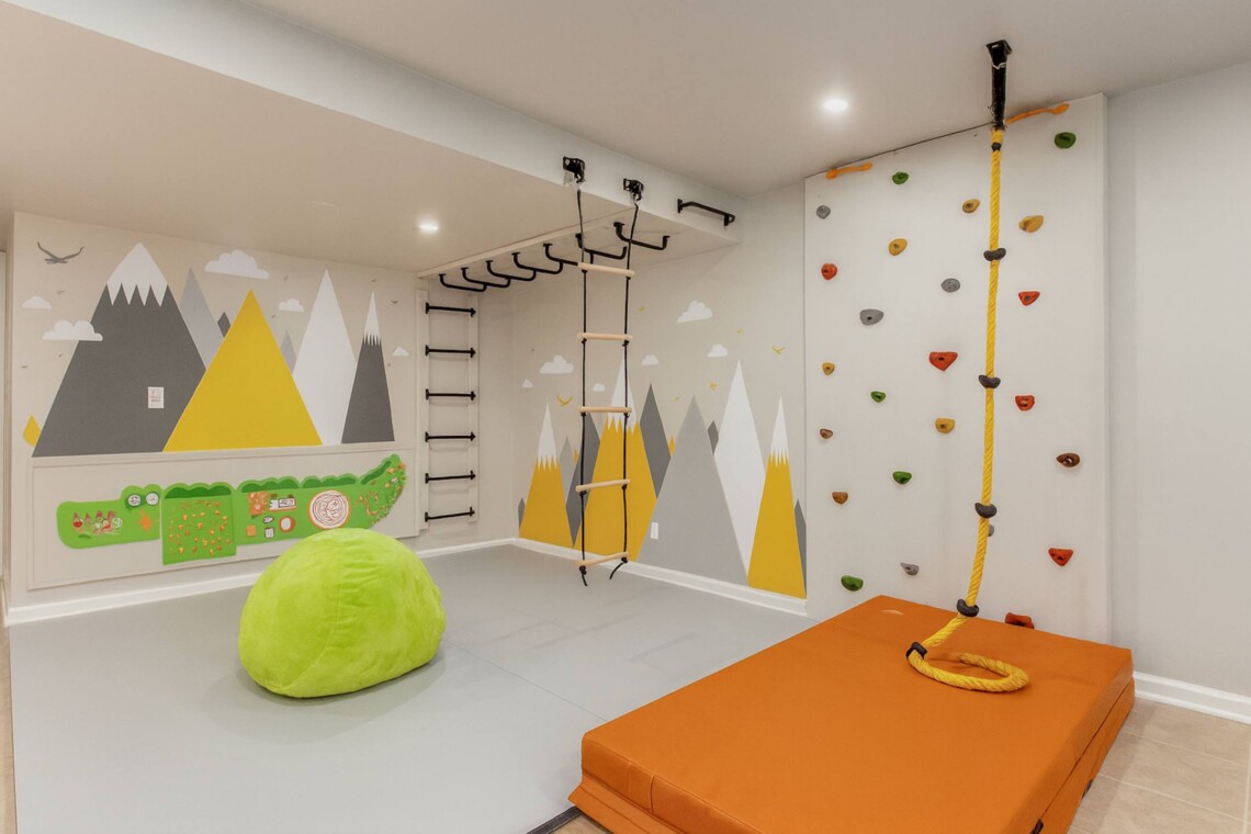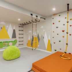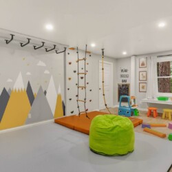 • A kids’ playroom featuring a climbing wall and monkey bars