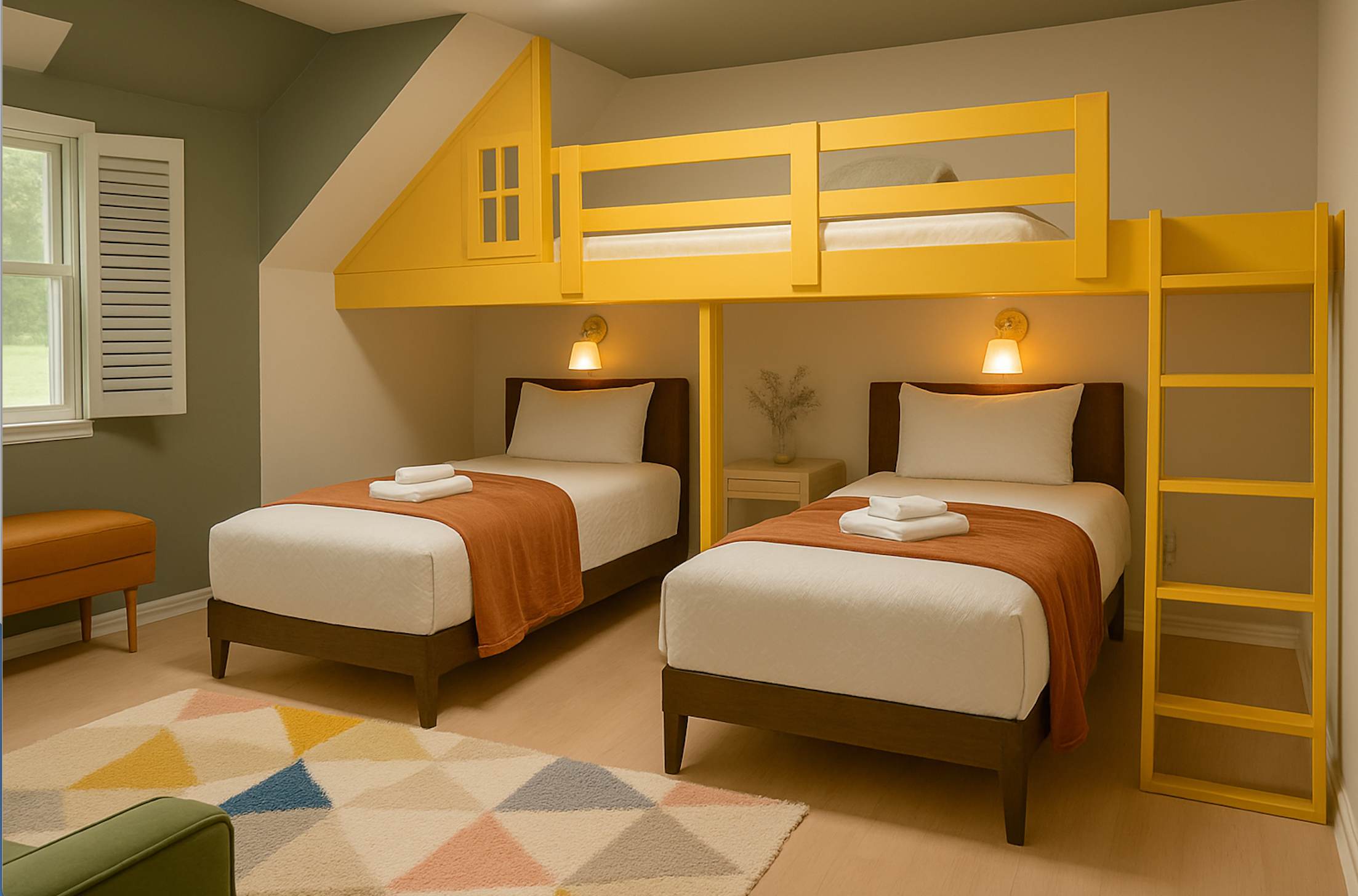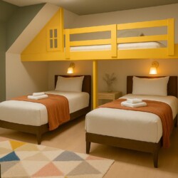 This bedroom is designed for memorable slumber parties for guests both young and old. There are two twin beds plus an additional loft bed above them. The upper loft bed can sleep one adult or two children.