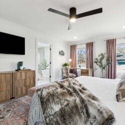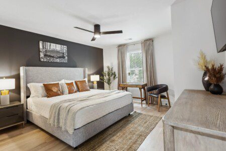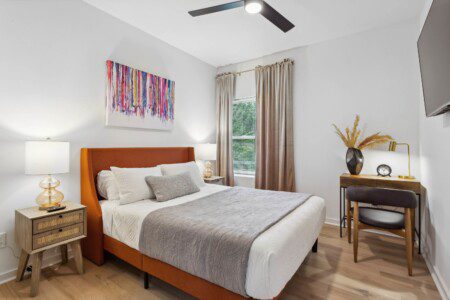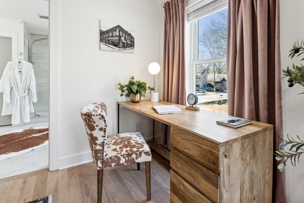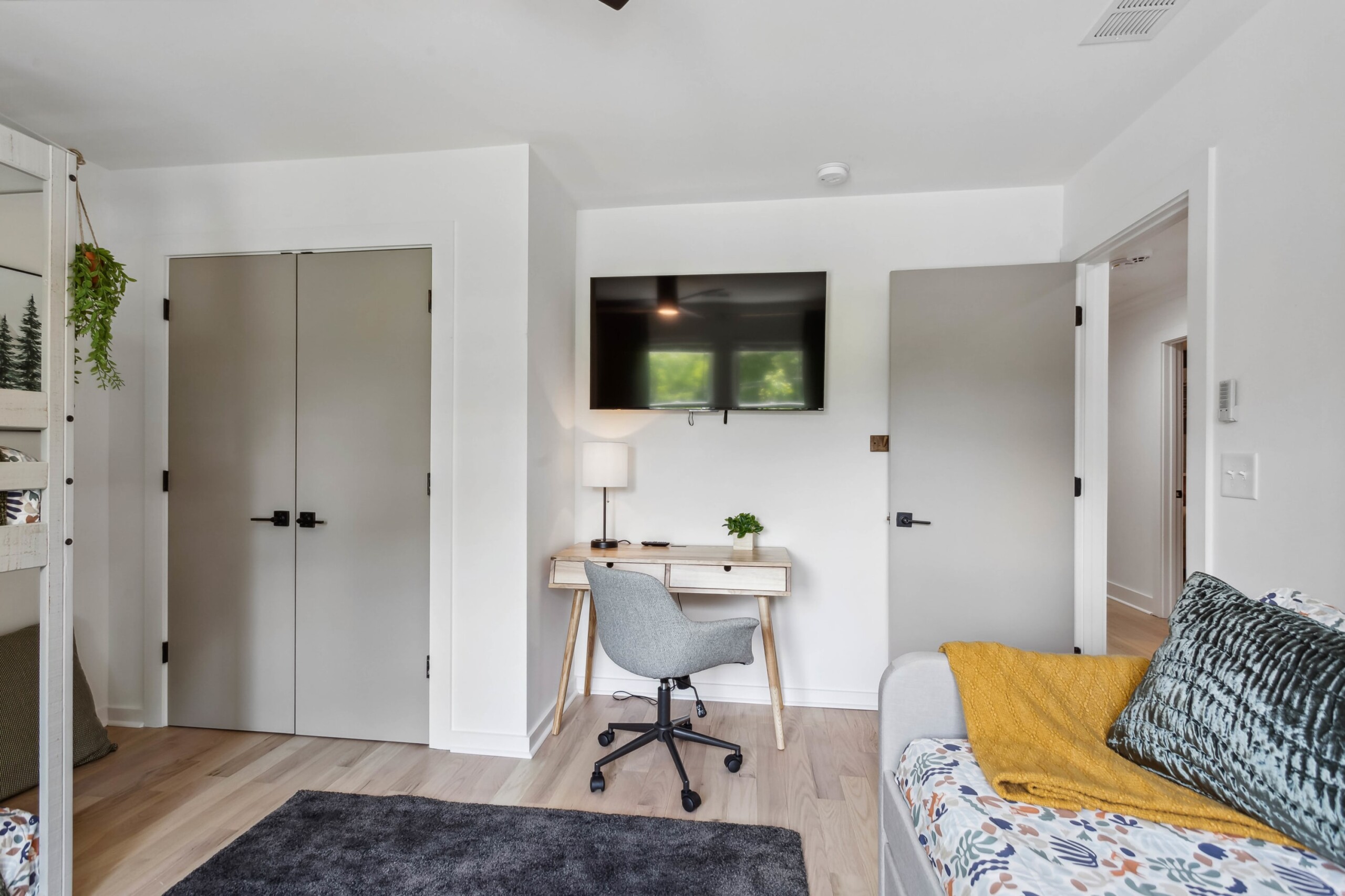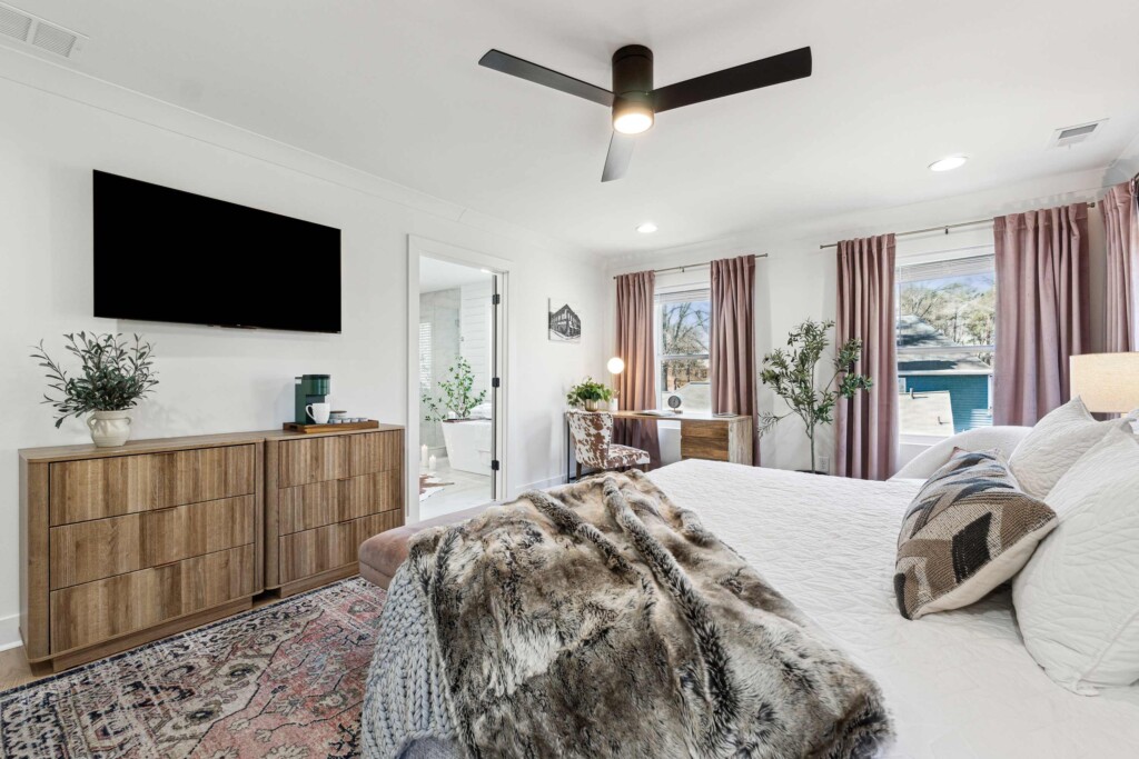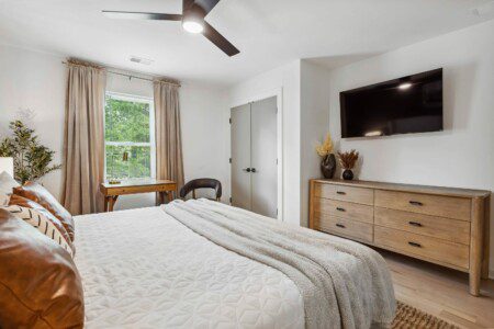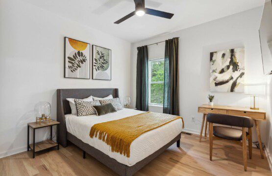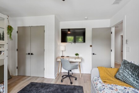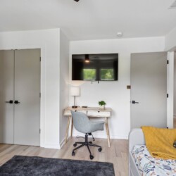 This bedroom has the same comfortable queen-sized bed, a wall-mounted 55″ Smart TV, and a desk, but different design and ambience.