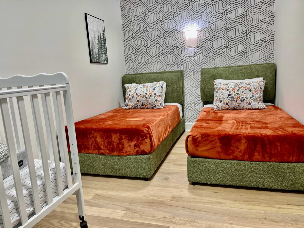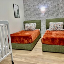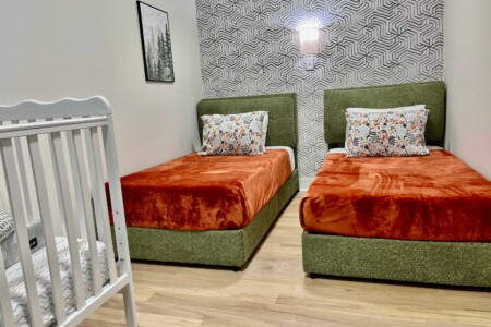 BEDROOM 2 (kids) has two single beds and a crib: it would be great for families with youngsters. Please keep in mind that this room is adjacent to the primary bedroom.