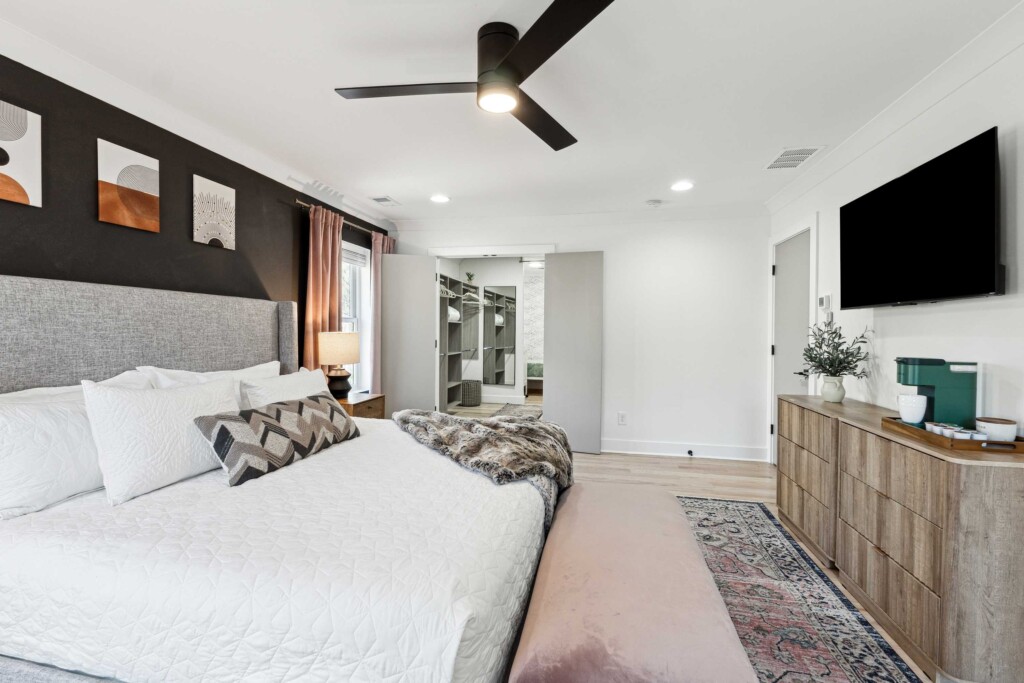 King-sized bed, a desk, a dresser and a 55″ Smart TV.