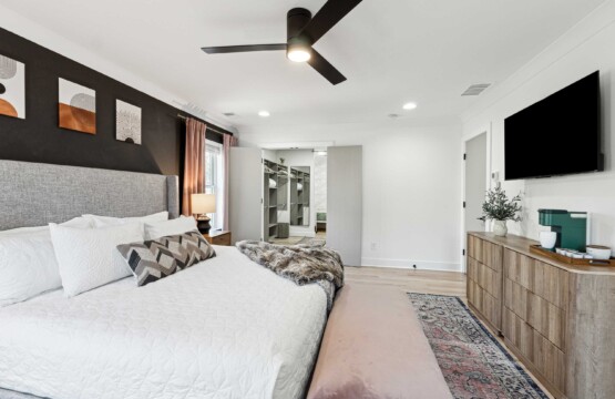 PRIMARY BEDROOM features a king-sized bed, a 55″ Smart TV, a relaxing chair and a writing desk.