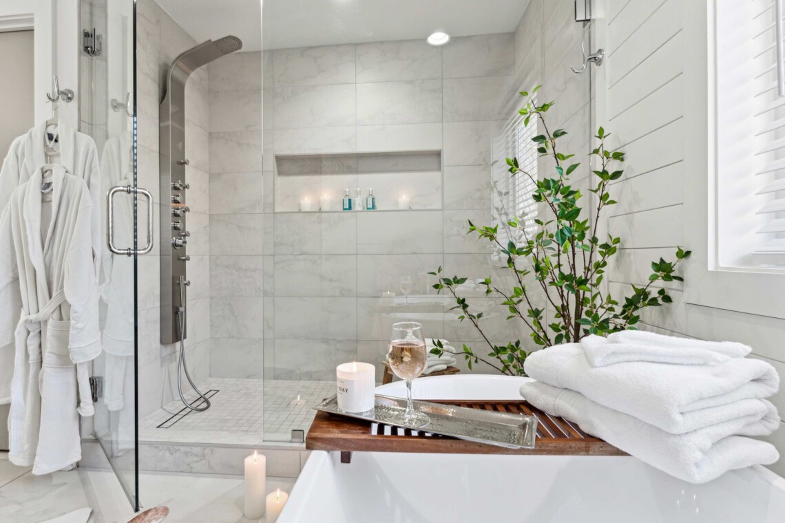 BATHROOM 4 has a walk-in shower, and the same luxurious amenities as the three other bathrooms in the house. All four of the lovely bathrooms are stocked with fresh towels and premium toiletries for your convenience and enjoyment.