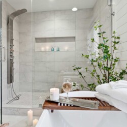 - Roll-in shower with shower bench or chair