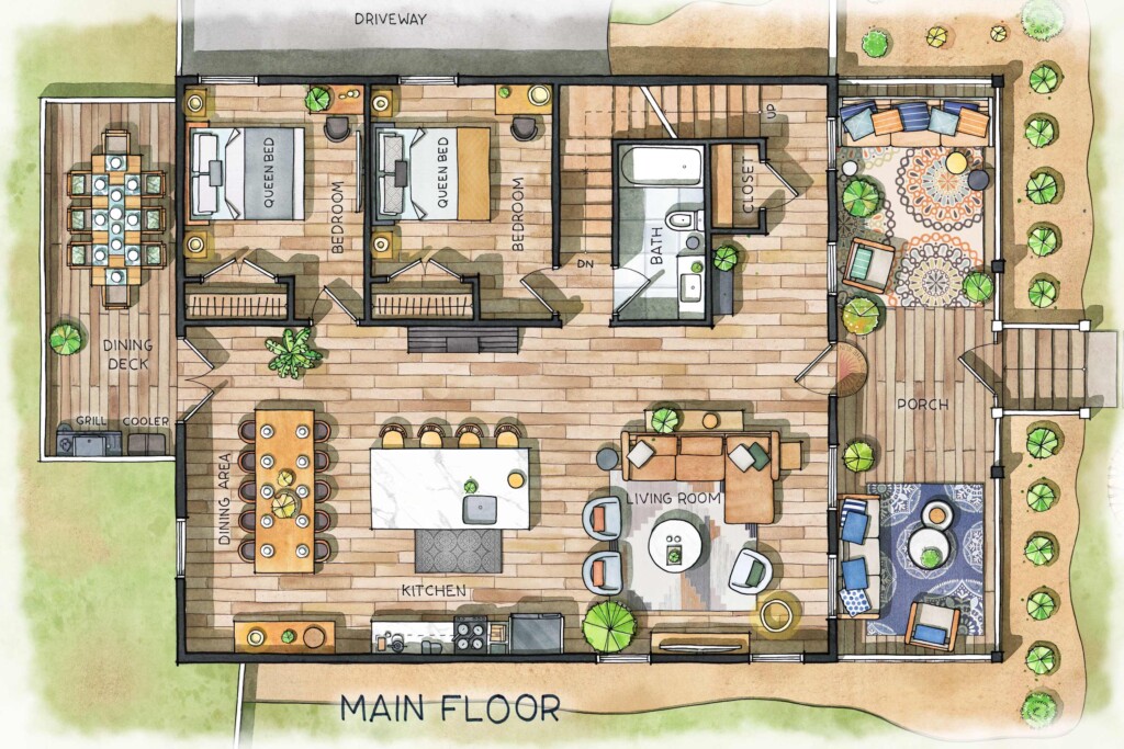 There is also a spacious open-air deck with great views of the forest below. This area features a massive dining table (seating for 8), a gas grill, and a cooler for the perfect evening drinks.