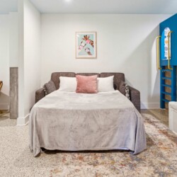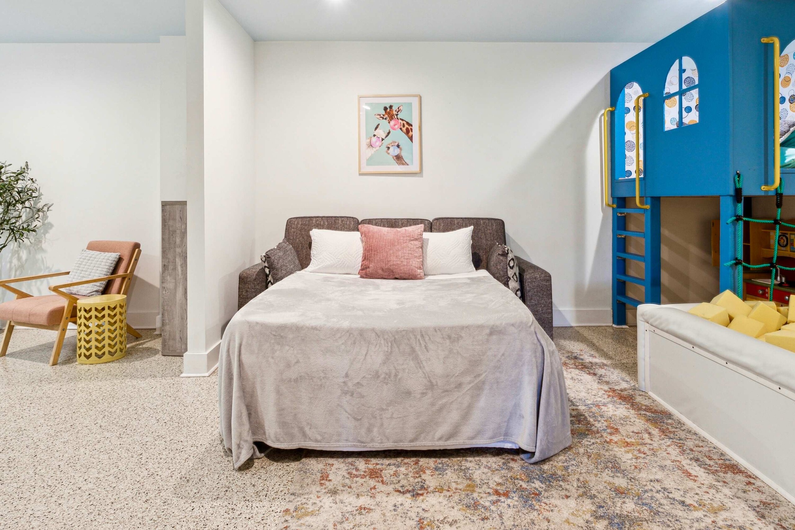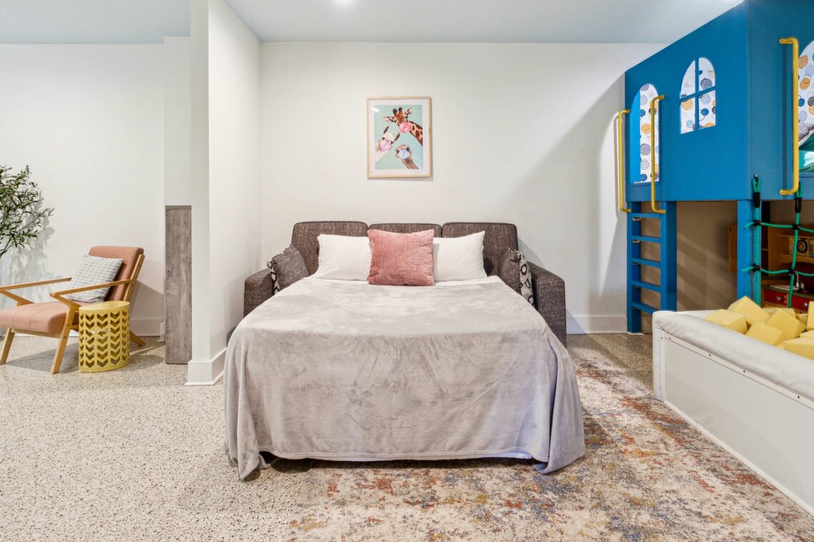 Queen size sofa-sleeper in the basement play room