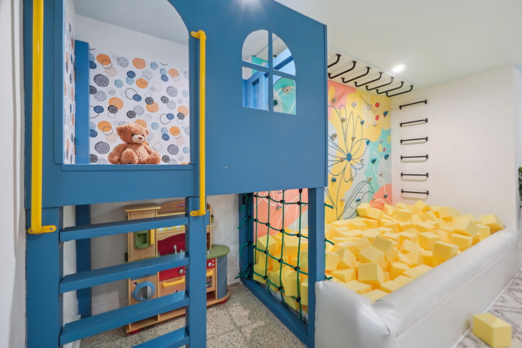 *Children’s play area: Climbing wall, Jungle Gym, Playhouse, Foam pit + baby gear available for use